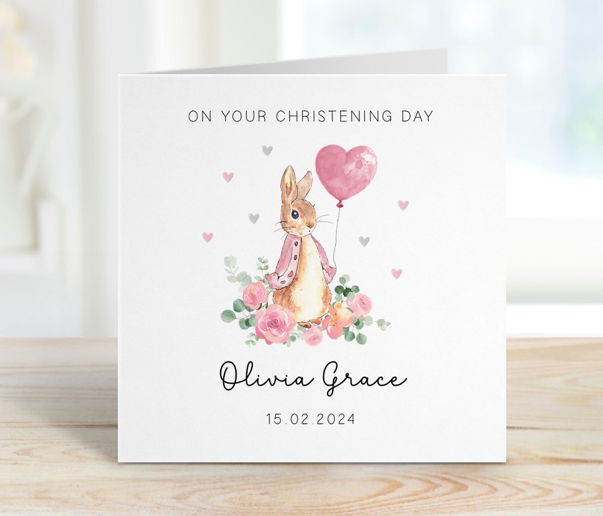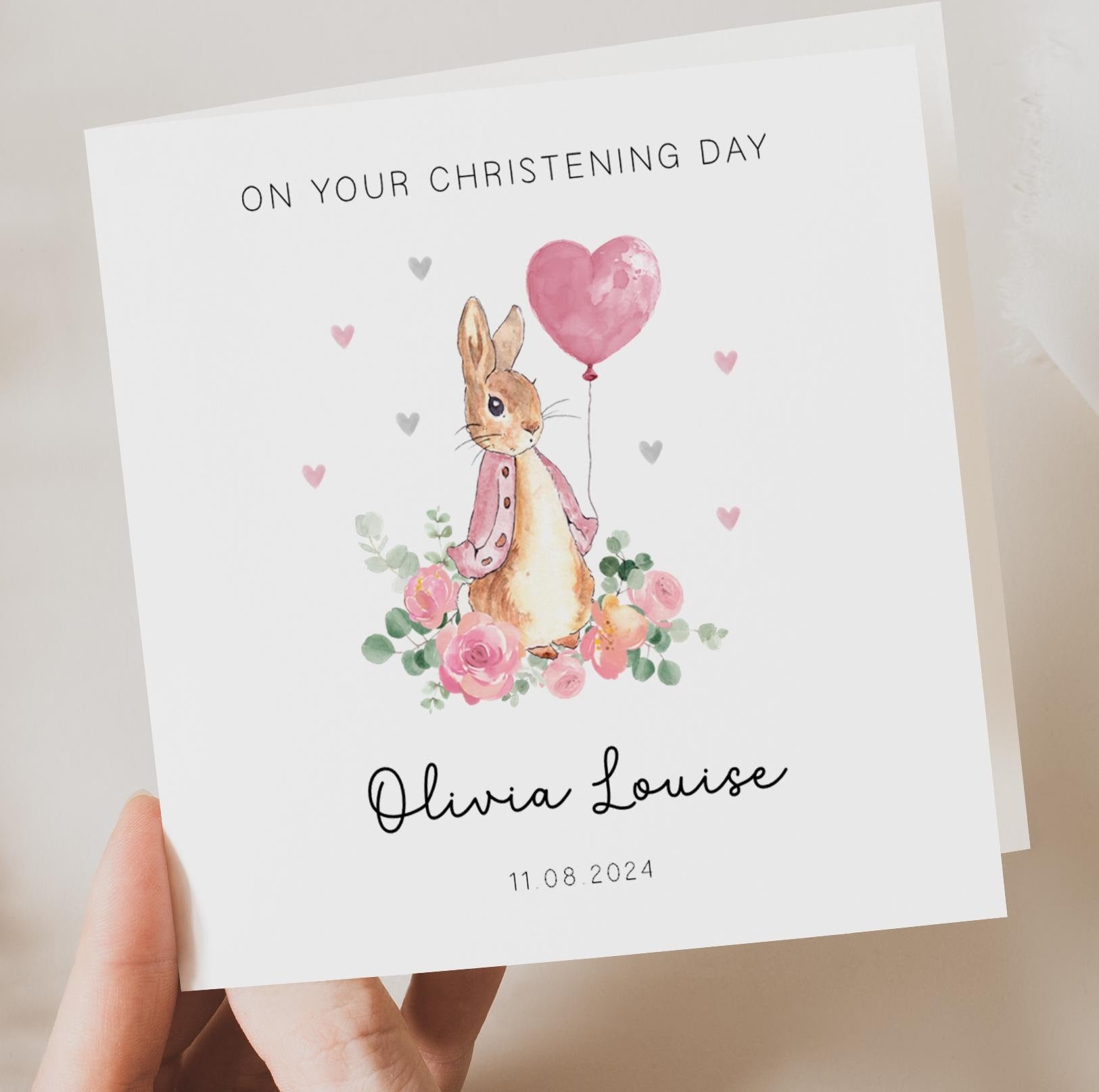 Classic Bunny Rabbit Christening Card - Pink Balloon