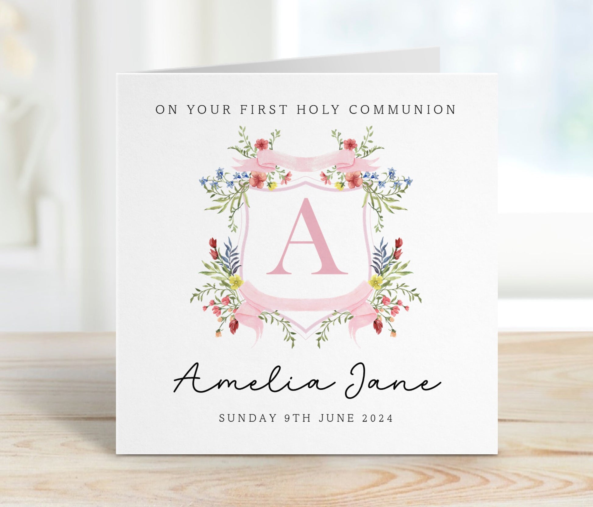 First 1st Holy Communion Card - Pink Floral Crest Initial